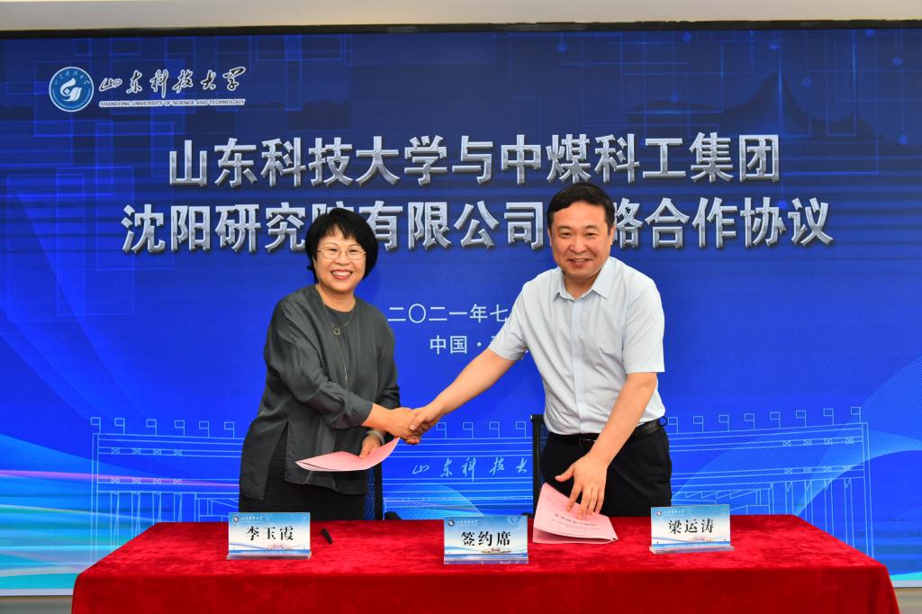 李玉霞与庞树栋、梁运涛、刘程代表学校与中煤科工集团南京设计院、沈阳研究院、西安研究院分别签订校企战略合作协议。