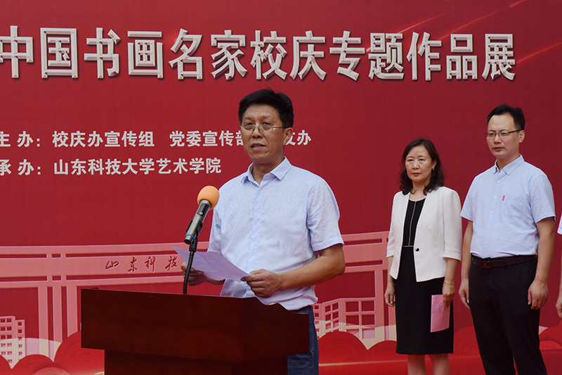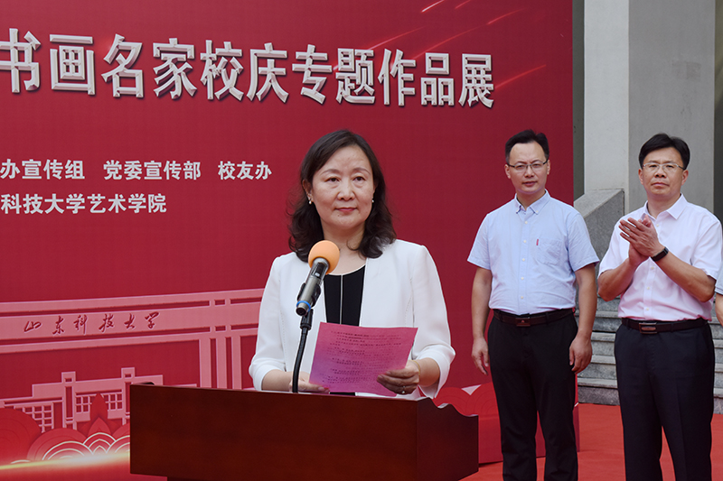 校党委副书记尹华出席开展仪式,并宣布书画展开展。校党委常委、宣传部部长李克周致辞,青岛西海岸新区教育文联主席武善领及西海岸新区文联、新区教育文联代表出席开展仪式。仪式由校文联常务副主席、艺术学院院长杨梅主持。