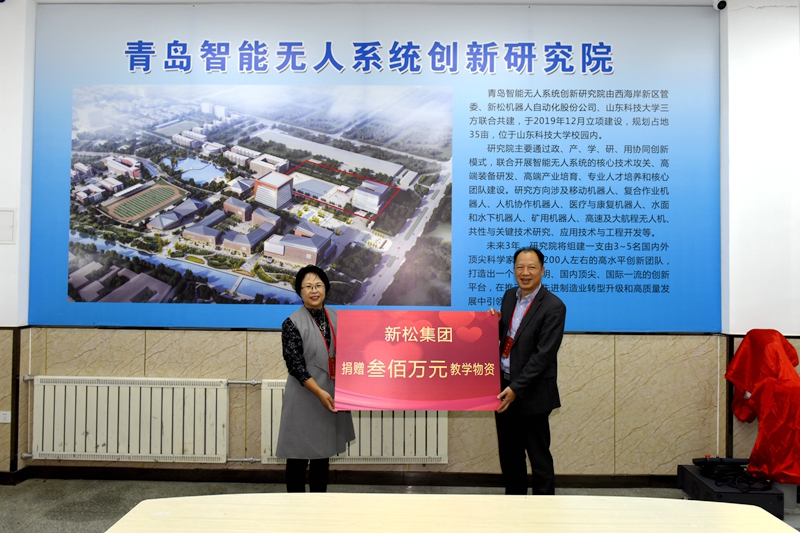 捐赠仪式上,刘班代表沈阳新松机器人自动化股份有限公司捐赠300万元教学物资支持学校教育事业发展,李玉霞代表学校接受捐赠,并回赠捐赠证书。双方共同为新松集团捐赠的机器人设备揭幕。