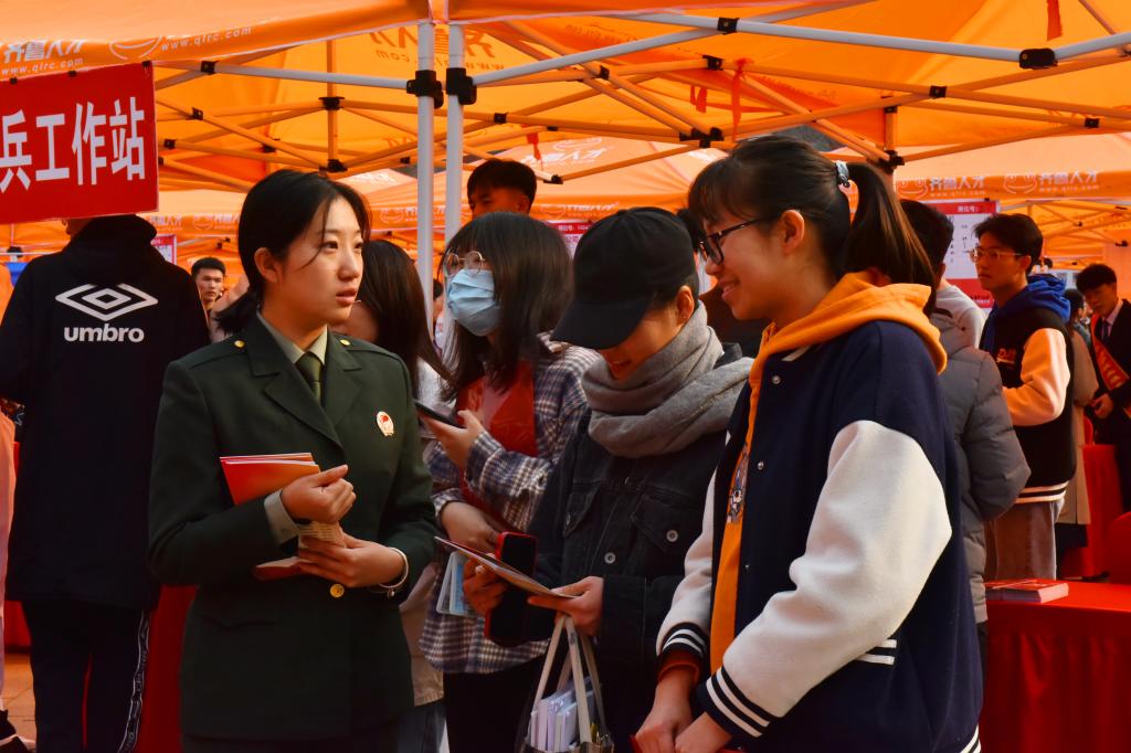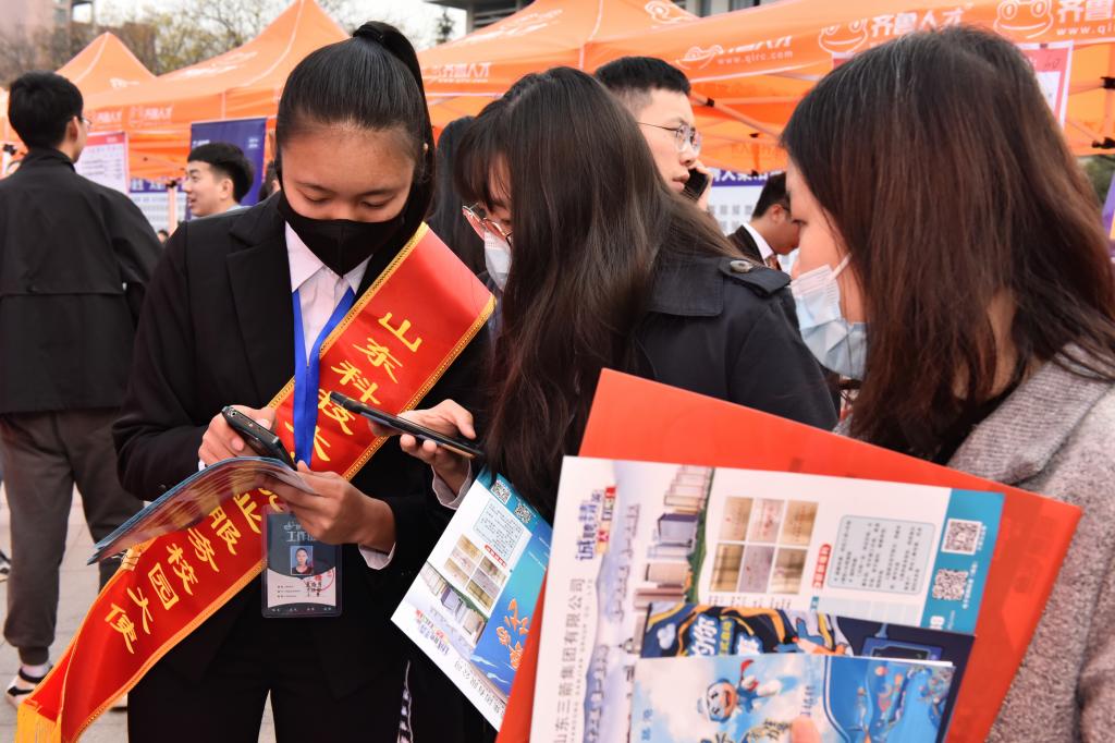 招聘会现场还活跃着就业志愿服务人员的身影。他们有的负责为来求职的应届生发放材料,有的负责对各展位进行推介和引导,有的负责为毕业生重点宣讲山东人才、西海岸新区引才最新政策,根据毕业生需求实时连线相关地市人社局为毕业生解答关心的问题,宣传基层就业、应征入伍、国际组织任职等相关政策。