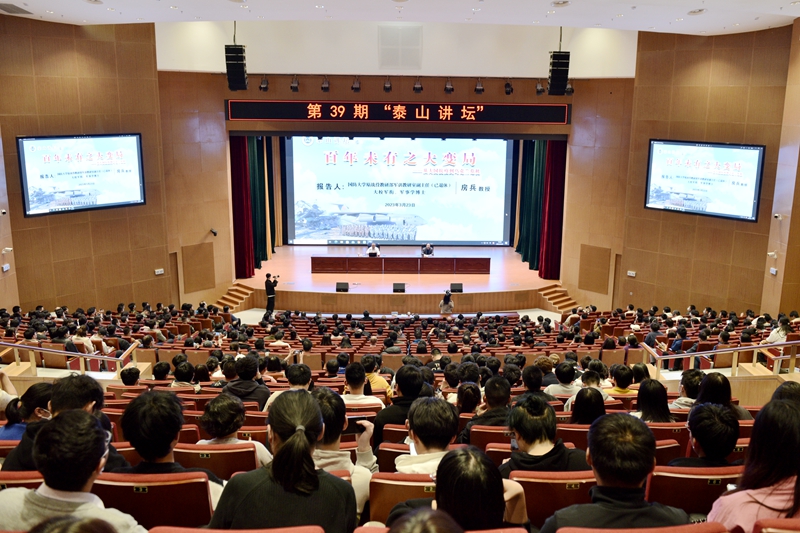 3月23日,国防大学原战役教研部军训教研室副主任、军事学博士、著名军事评论员房兵教授做客贝博官网“泰山讲坛”,以“百年未有之大变局——从大国抗疫到乌克兰危机”为主题为师生作专题报告。报告会由校党委常委、宣传部部长李克周主持。
