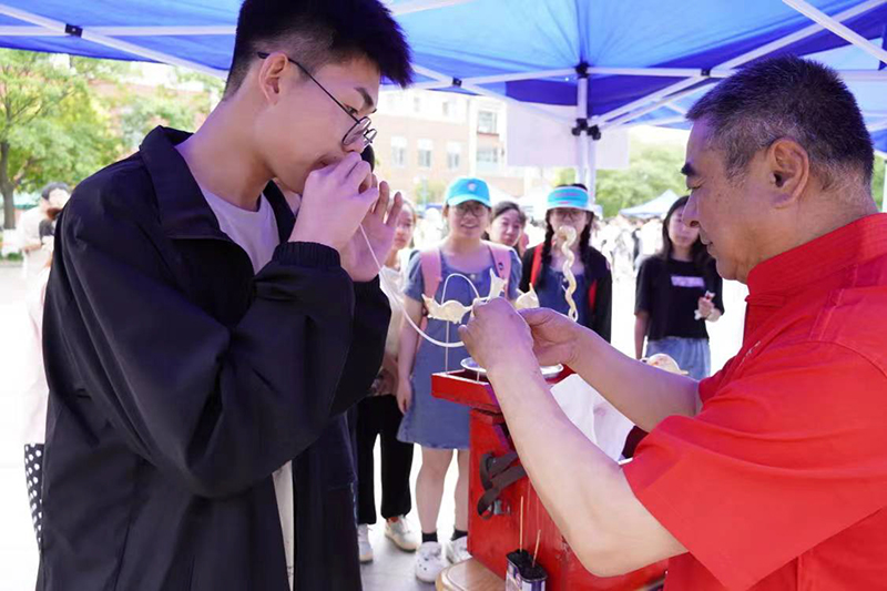 活动邀请4位非遗传承人走进校园,拉近了学生与非遗的距离。现场共设置皮影戏、吹糖人、捏面人、年画、画扇、扎染、陶艺等12项体验展示活动,让学生在“学”与“做”中亲身体验传统文化的独特魅力。