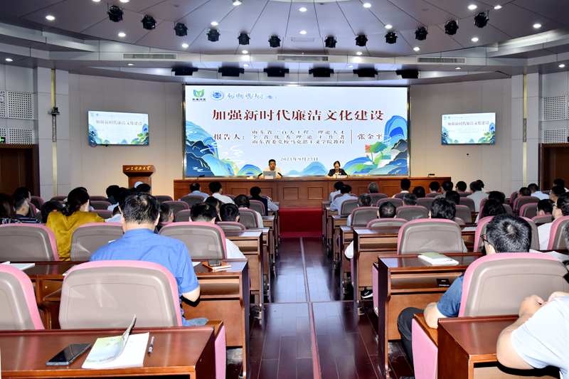 9月27日,BB贝博艾弗森官网第42期“泰山讲坛”暨青廉课堂在逸夫讲堂开讲。山东省“百人工程”理论人才、中共山东省委党校(山东行政学院)张金平教授为全校干部上了一堂生动的“加强新时代廉洁文化建设”课,引导广大党员干部拧紧“总开关”,筑牢拒腐防变的思想防线。党委常委、纪委书记夏侯雪娇主持。党委常委、宣传部部长李克周参加。学校中层以上干部(含学术院长、学术副院长)、机关科级干部、全体学生工作干部参会。