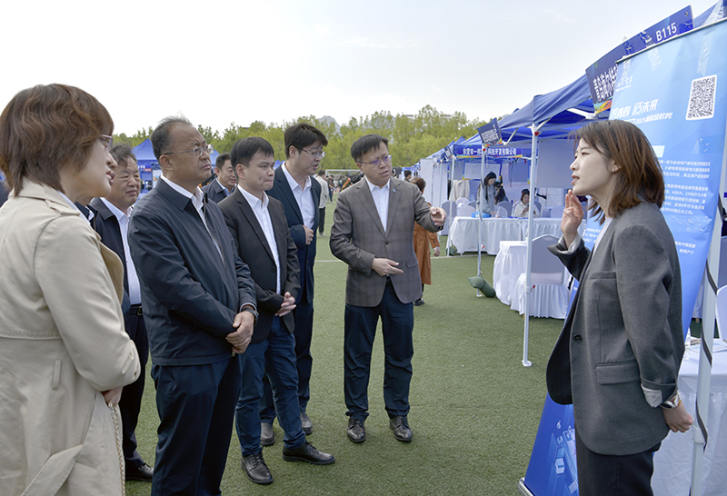 与会嘉宾和校领导在招聘会现场了解情况