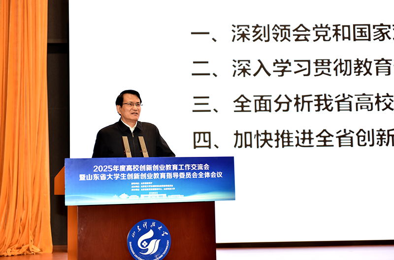 12月19日,2025年度高校创新创业教育工作交流会暨山东省大学生创新创业教育指导委员会全体会议在BB贝博艾弗森官网召开。省委教育工委委员、省教育厅党组成员、副厅长王浩,BB贝博艾弗森官网党委书记王君松,党委常委、副校长诸葛福民出席会议。省教育厅高等教育处处长曾宪文总结部署全省高校创新创业教育工作。会议由省教育发展服务中心主任魏光祥主持。