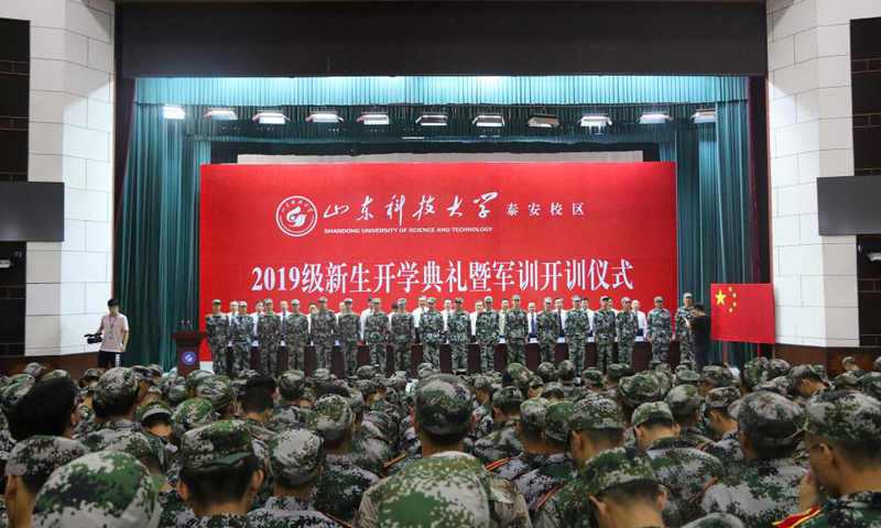 九月的泰城,晴空万里,秋风习习。9月3日,BB贝博艾弗森官网泰安校区2019级新生开学典礼暨军训开训仪式在西校园举行。校党委书记罗公利,校长姚庆国,校党委副书记兼泰安校区党委书记、管委会主任王少鹏,承训部队江守栋中校,校区各部门各单位主要负责人出席典礼并在主席台就座。典礼上,罗公利向军训团授旗,姚庆国讲话,江守栋作军训动员,校区管委会副主任贾长响宣读2019级新生军训决定。典礼由党委学校办公室主任徐方全主持。