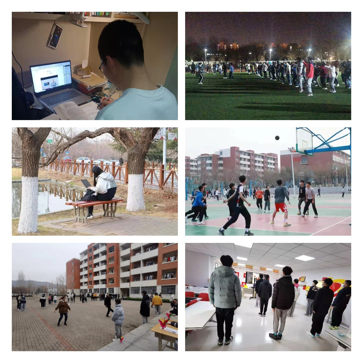 在全体师生的共同努力下,学生生活区呈现出井然有序、生机盎然的景象。网课有条不紊、生活区干净整洁,同学们坚持戴口罩、宿舍每天消杀、通风,操场上也尽是同学们打篮球、踢足球、跳健身操的身影……