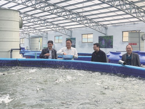王衍国(左二)在工厂化渔业养殖厂喂鱼