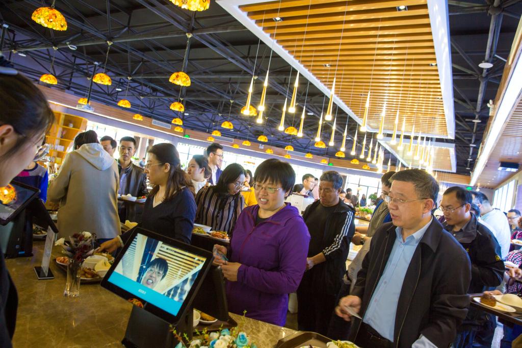 继“刷脸”入学之后,“刷脸”吃饭又成了学校的新时尚。2018年,学校将改善教工就餐条件作为民生工程的主要内容抓紧抓实,决定筹建教工餐厅。2019年5月,教工餐厅顺利开业,教职工携带身份证,踊跃到教工餐厅就餐。只需在读取身份证信息验证教师身份后“刷”一下脸,就能把人脸信息录入相应应用系统的数据库,从此可以“刷脸”进餐厅“刷脸”消费,一路畅行无阻。“刷脸”买单大大节省了教工买饭排队的时间,再加上餐厅环境明亮整洁、服务周到贴心、饭菜丰盛可口,广大教职工吃得放心、称心、舒心,教工餐厅一时好评如潮。自动化学院老师张婧高兴地说:“现在学校真正实现了靠‘脸’吃饭,我们可以多一点时间科研、教学或去休息了。”