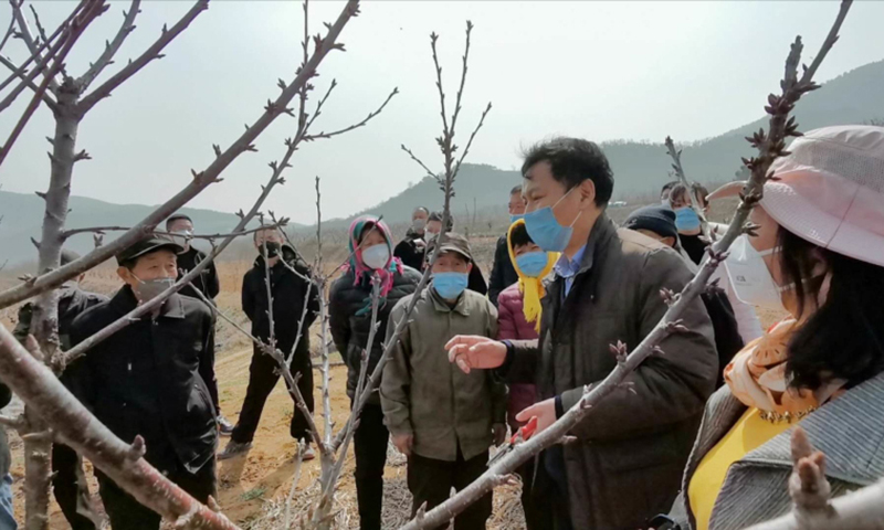 而时值疫情防控期间,“上千亩樱桃有的枯萎,上哪找专家来指导?”面对农村农民的难题,曾庆田指出:“要把老百姓的事当成自己的事,抓紧办、尽快办、办出成效。”大家马不停蹄,几经周折联系到果树学专家刘更森教授,与果农进行视频连线指导。次日,又邀请刘更森来黄泥巷村,深入田间地头,现场指导23户果农剪枝修干,传授祛除虫害、施肥灌溉等技能,得到种植户的认可。