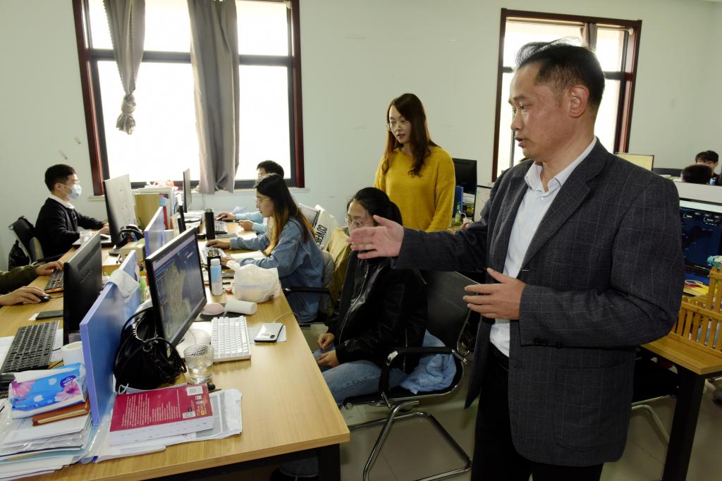 孙林在指导团队成员分析数据
