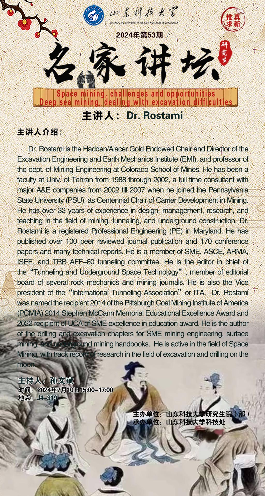 “名家讲坛”2024年第53期:Space mining, challenges and opportunities .Deep sea mining, dealing with excavation difficulties