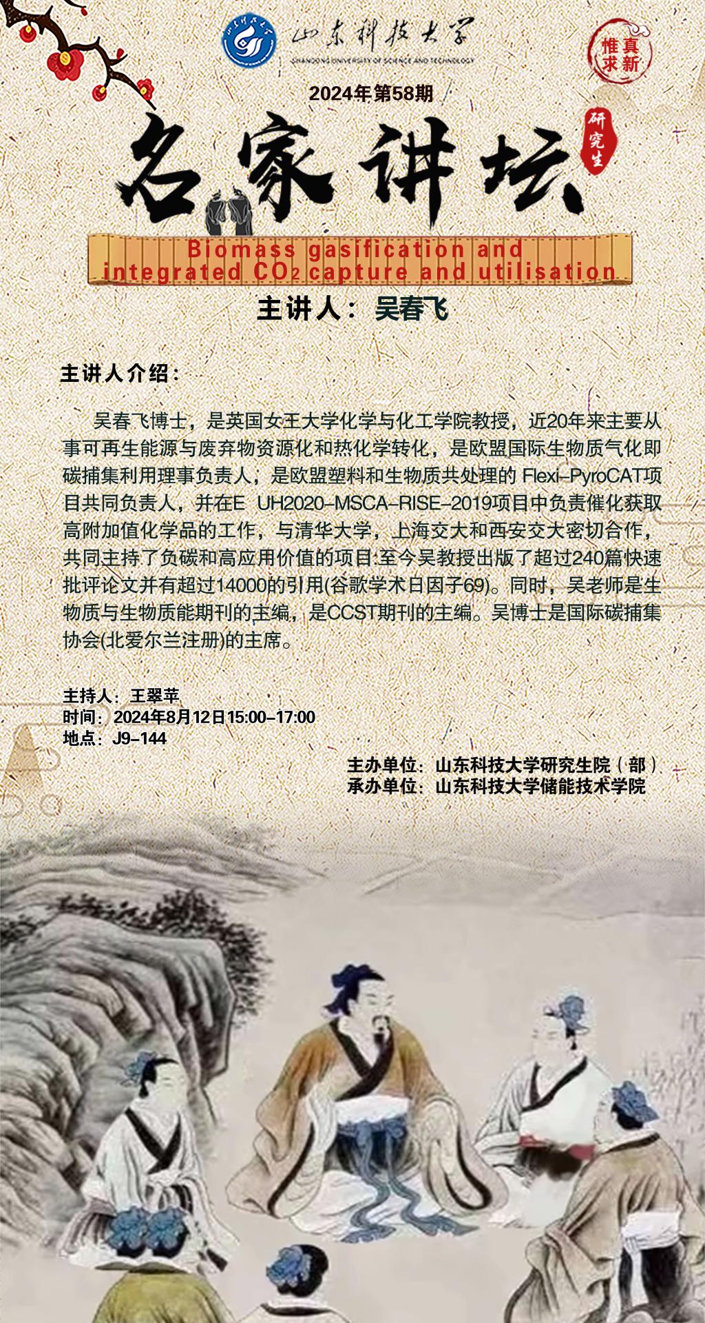 “名家讲坛”2024年第58期:Biomass gasification and integrated CO₂ capture and utilisation(总952期)