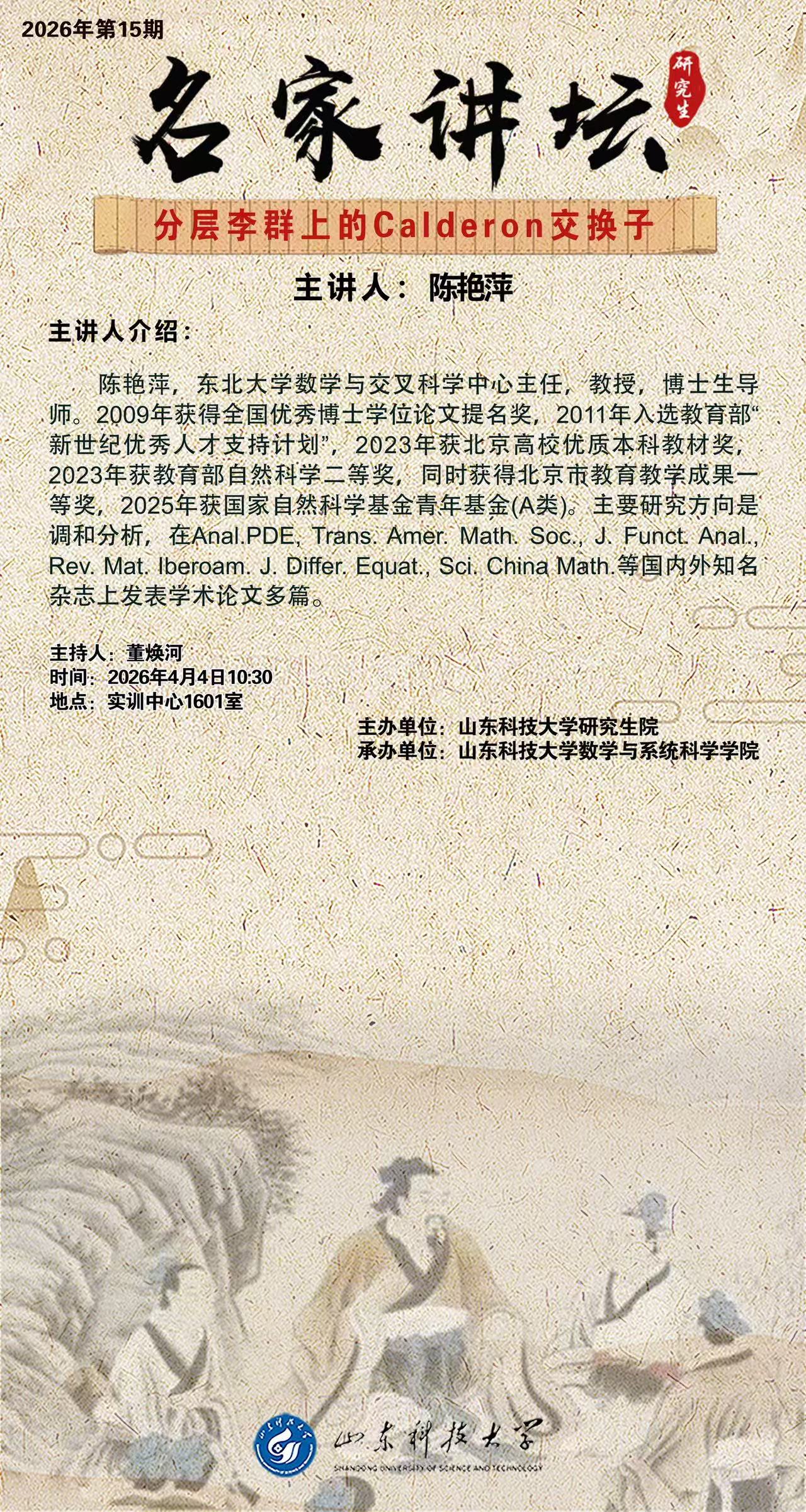 “名家讲坛”2026年第15期:分层李群上的Calderon交换子(总1117期)