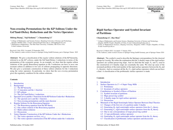 近日,BB贝博艾弗森官网数学与系统科学学院泰山学者李传忠教授研究团队在非线性可积系统与孤立子理论领域取得重要突破,相关研究成果Non-crossing permutations for the KP solitons under the Gel’fand-Dickey reductions and the vertex operator发表在国际顶级期刊《Communications in Mathematical Physics》。这是该团队继2024年在规范理论与几何朗兰兹纲领领域取得重大进展后,再次在该权威期刊发表其他领域关键研究成果。